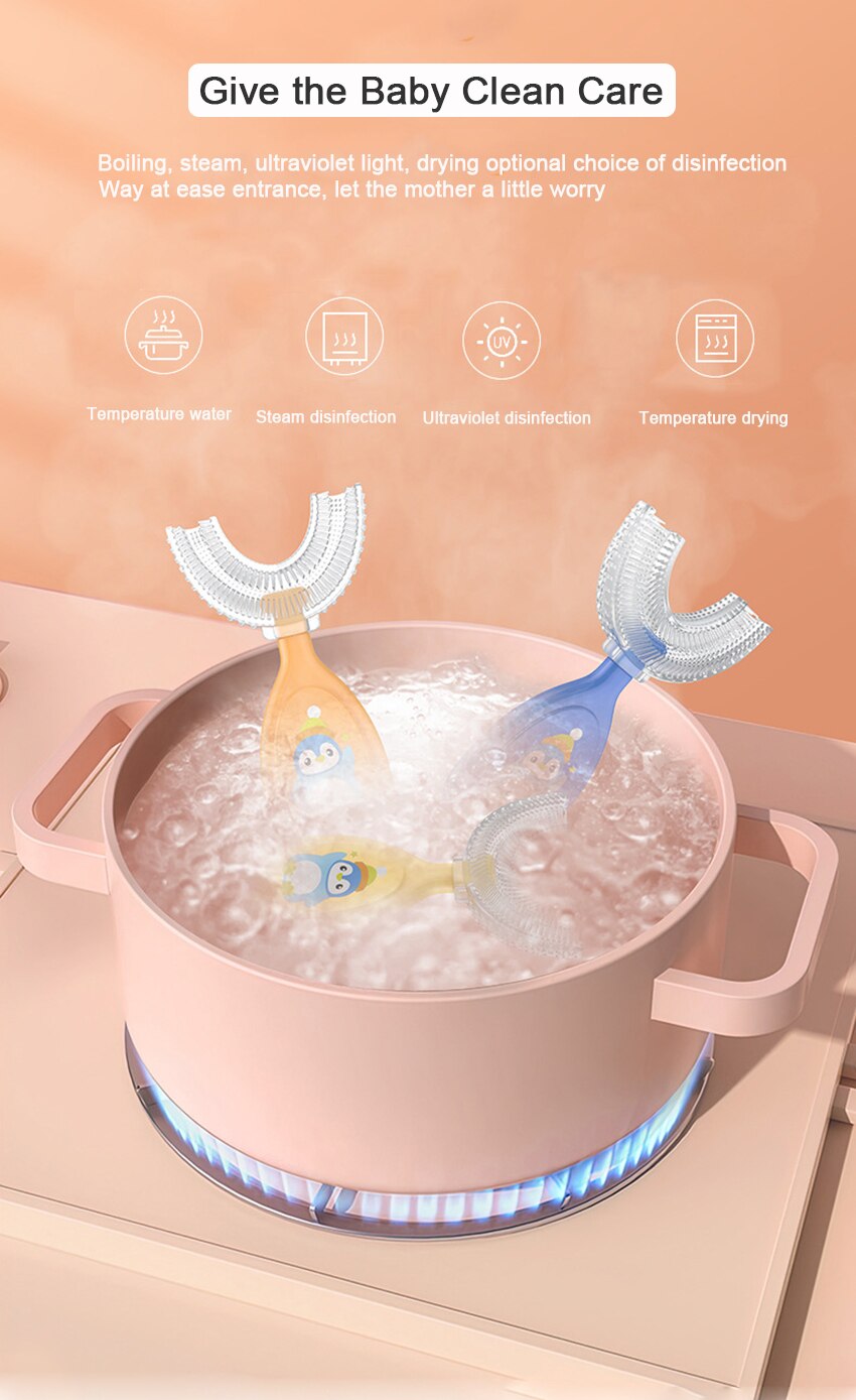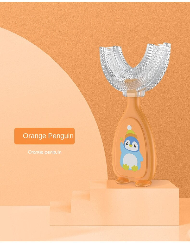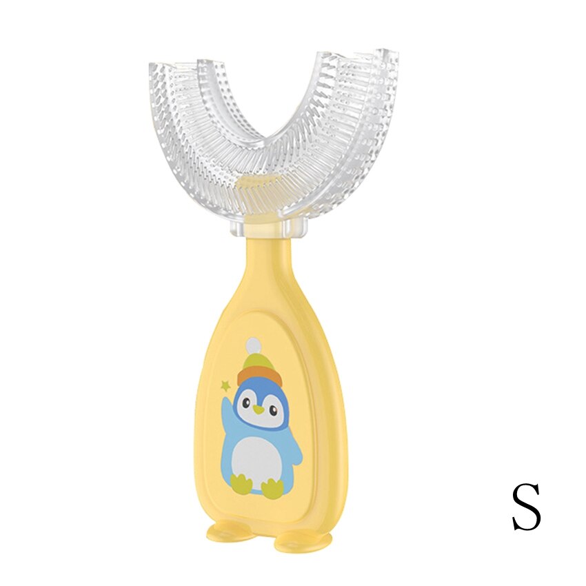 Product name: U-shaped manual silicone toothbrush Color: orange, blue, yellow Size: Small (2-6 years old) Large (6-12 years old) Small brush head 5cm long 9.8cm Large brush head 5.5cm long 10.2cm Material: brush head/liquid silicone Handle: food grade pp