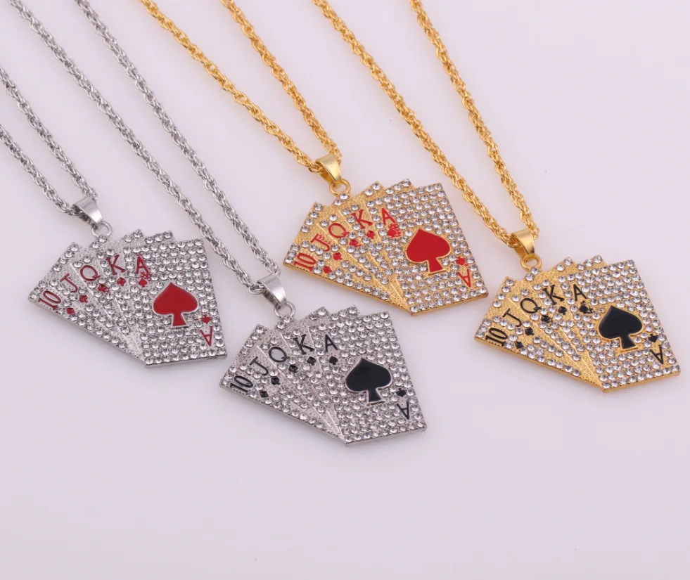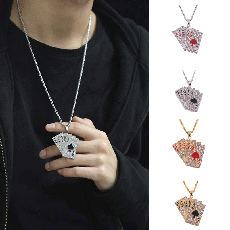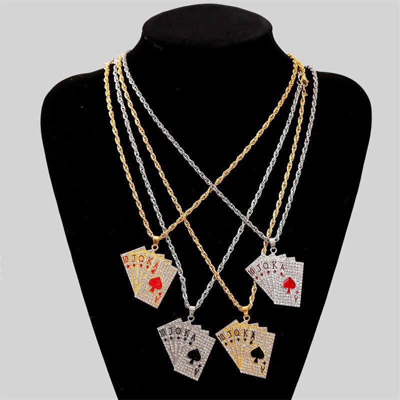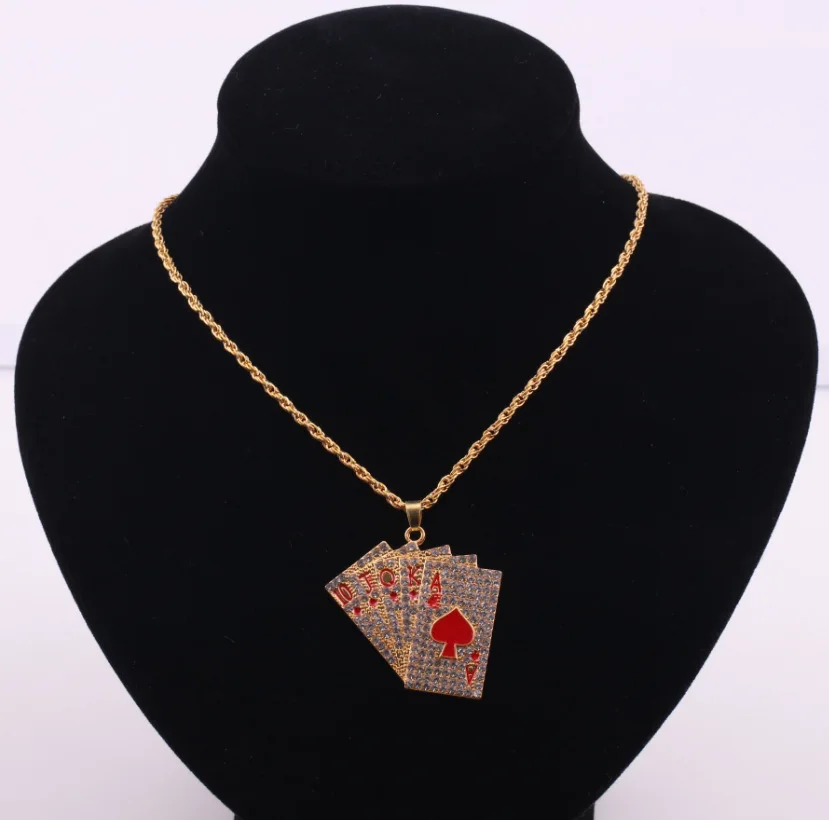 Name: European and American new fashion jewelry alloy full diamond hip hop poker straight flush pendant long men's and women's necklace Style: hip-hop, punk, cool Product material: alloy Product size: width 41.5mm* height 40.4mm, chain length 60cm Product weight: 20.63g There may be some errors, the above data is for reference only![]()